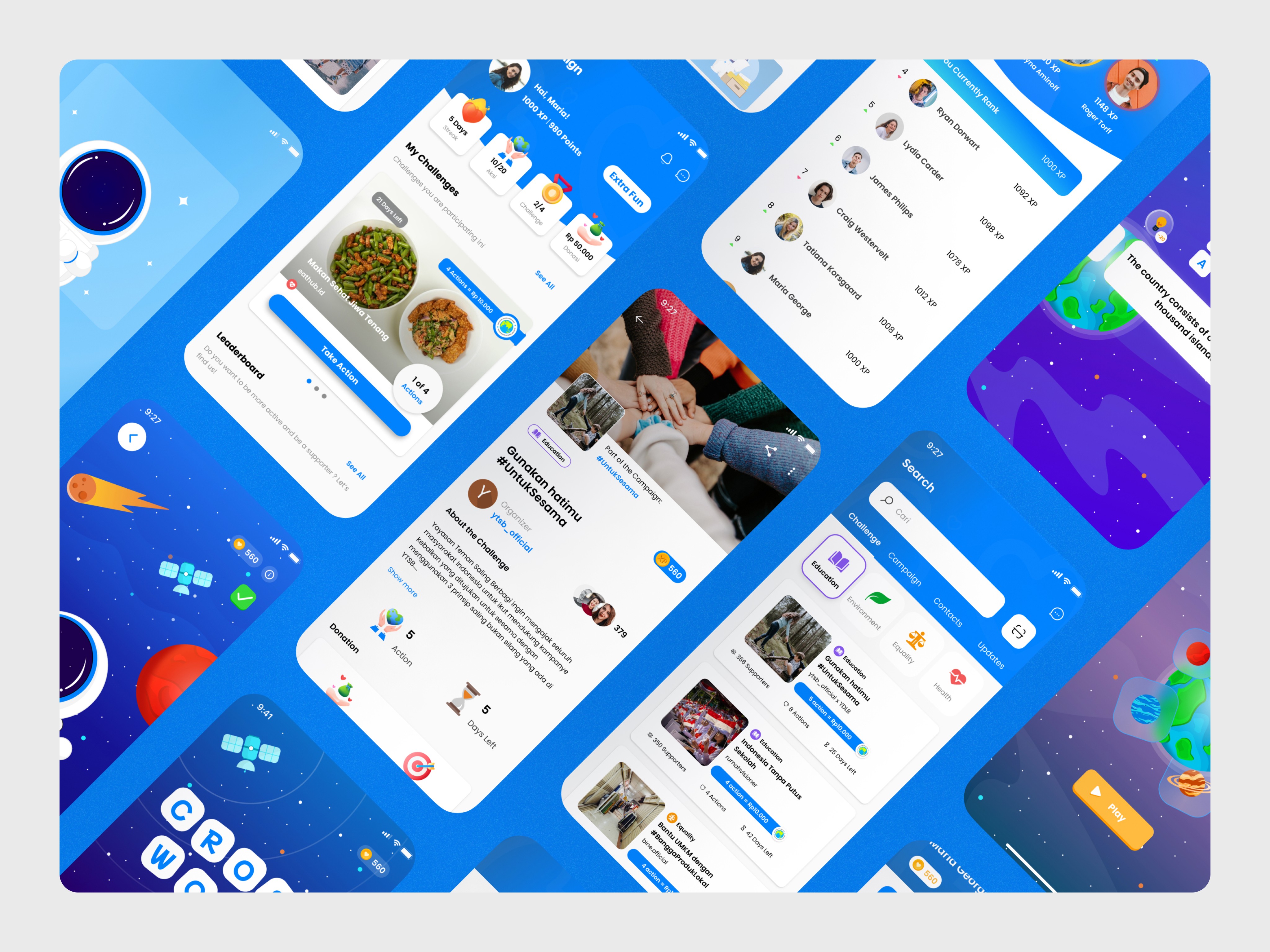 As a UI/UX Design Intern in the Kampus Merdeka program, I collaborated with fellow designers to develop gamification features for the Campaign #ForChange app. Together, we focused on transforming social actions into an interactive journey, encouraging users to build positive habits through game mechanics such as challenges, XP points, and reward systems.